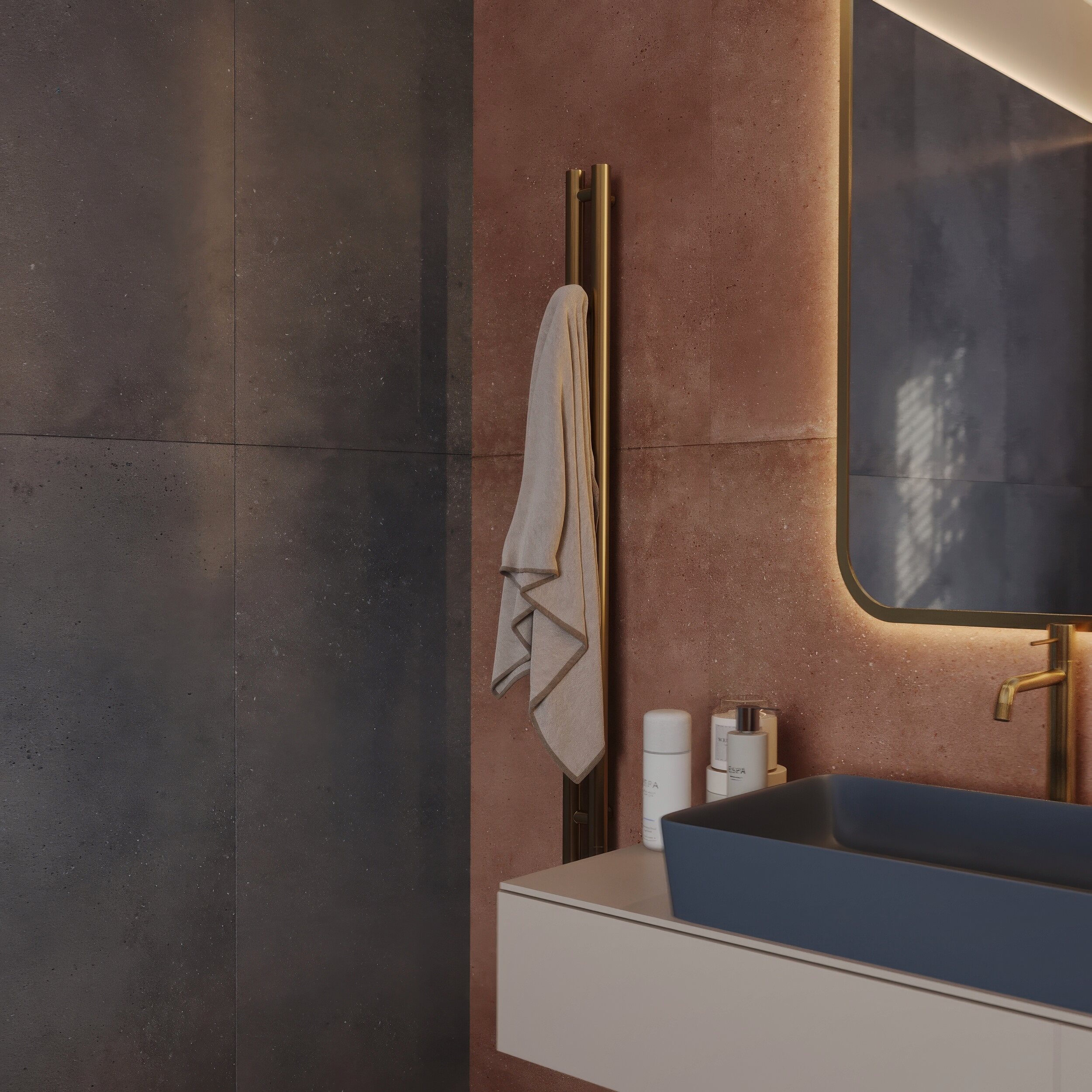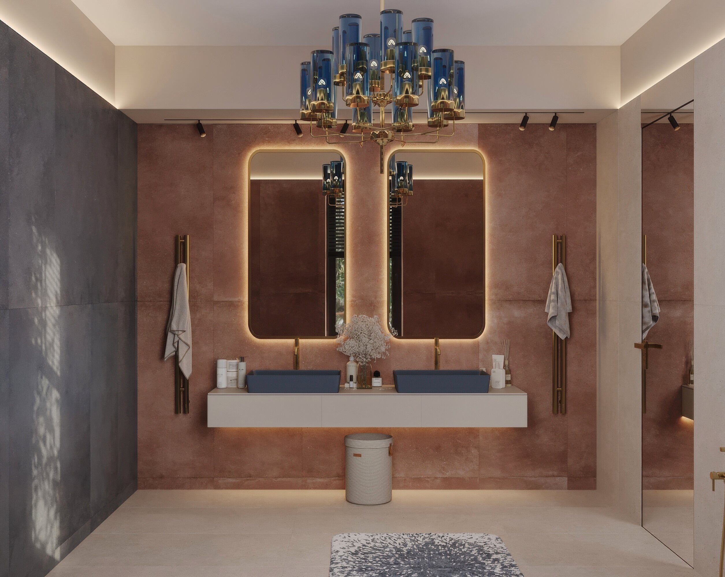 Мастер-санузел для молодой пары, стремящейся к смелым и нестандартным решениям. Основной концепцией стало сочетание двух ярких цветов, что было реализовано с помощью сантехники от Аквамира: отдельно стоящей ванны глубокого терракотового оттенка и выразительной синей раковины. Контрастная палитра гармонично дополняется бежевым унитазом, создавая сбалансированный цветовой ансамбль. Для усиления эффекта плитка была подобрана в тон сантехники, а акцентные элементы — смесители, кнопка смыва, напольный смеситель для ванны — выполнены в элегантном золотом цвете. Такое сочетание материалов и оттенков подчеркивает современный стиль интерьера, придавая пространству индивидуальность и глубину.